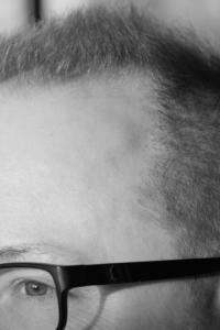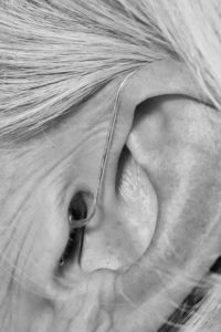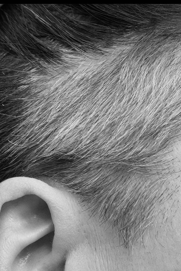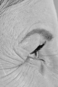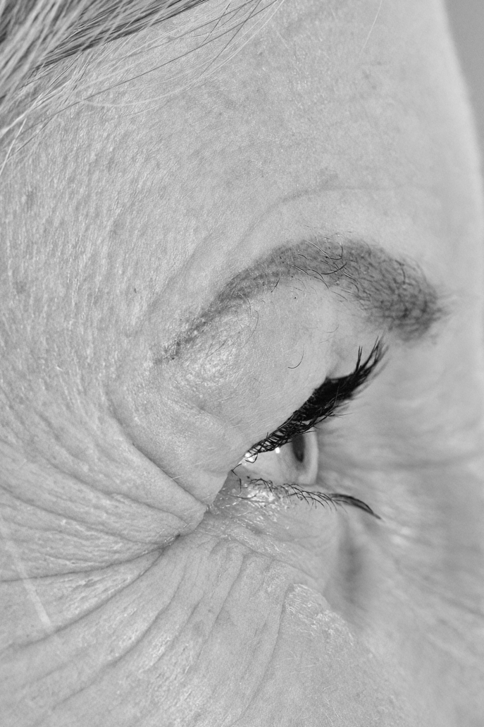 Im Zentrum steht ein frontal aufgenommenes Porträt. Der direkte Blick schafft eine stille Begegnung zwischen der fotografierten Person und dem Betrachter. Zwei Detailaufnahmen begleiten dieses Bild: Spuren eines Lebens: Haut, Narben, Falten, Tattoos, kleine Eigenheiten des Körpers.